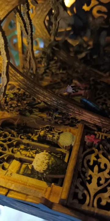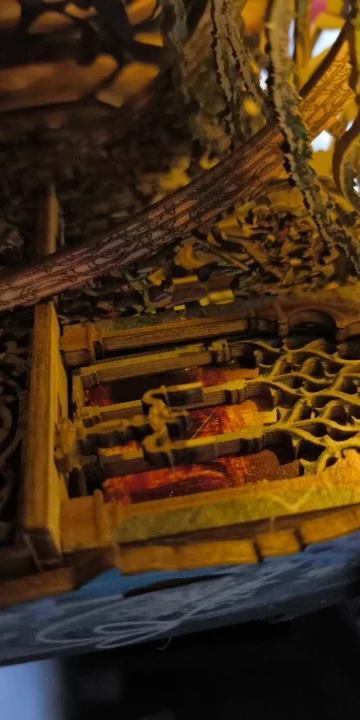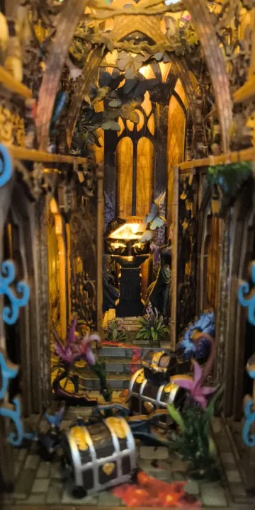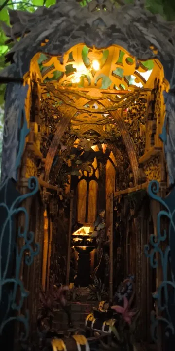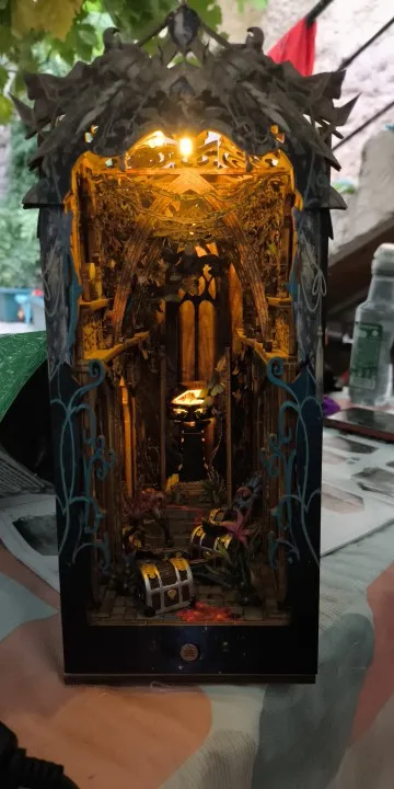 Ce book nook représente la bibliothèque chaleureuse d’un explorateur passionné. À travers une arche illuminée, on découvre des étagères remplies de livres anciens et d’objets mystérieux. Un petit bureau et un chevalet suggèrent des recherches en cours et des voyages lointains. Les détails minutieux créent une ambiance immersive et raffinée. L’éclairage doré met en valeur chaque élément et donne vie à la scène. Placé entre vos livres, il transforme votre étagère en véritable fenêtre vers l’aventure.